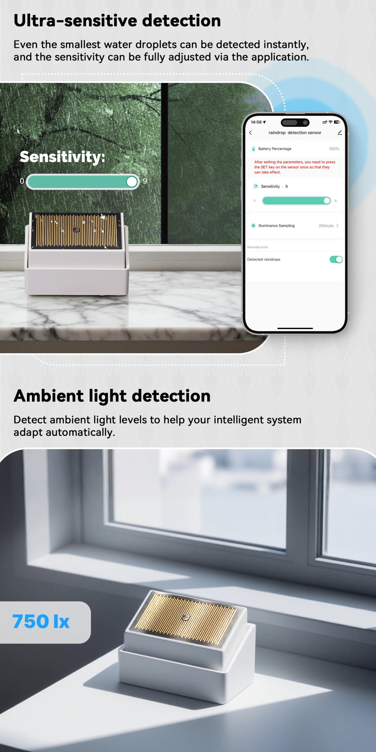 Smart Home Rain Sensor App Remote Detection IPX4 Outdoor Light Sensor